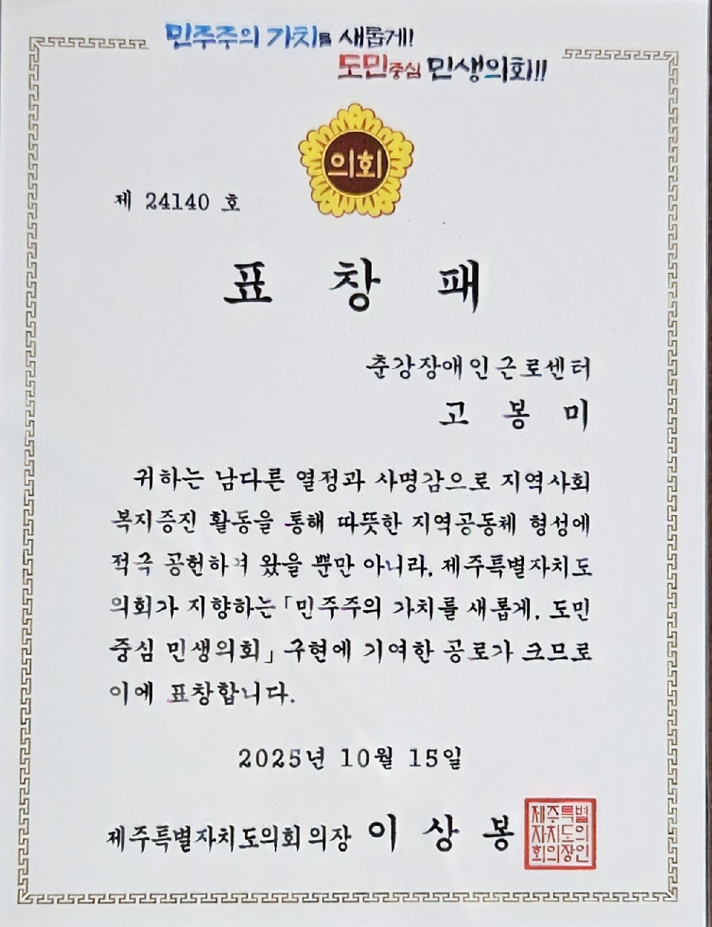 이 날 세탁사업부 고봉미 사원이 제주도의회 의장상을 수상하였습니다. |